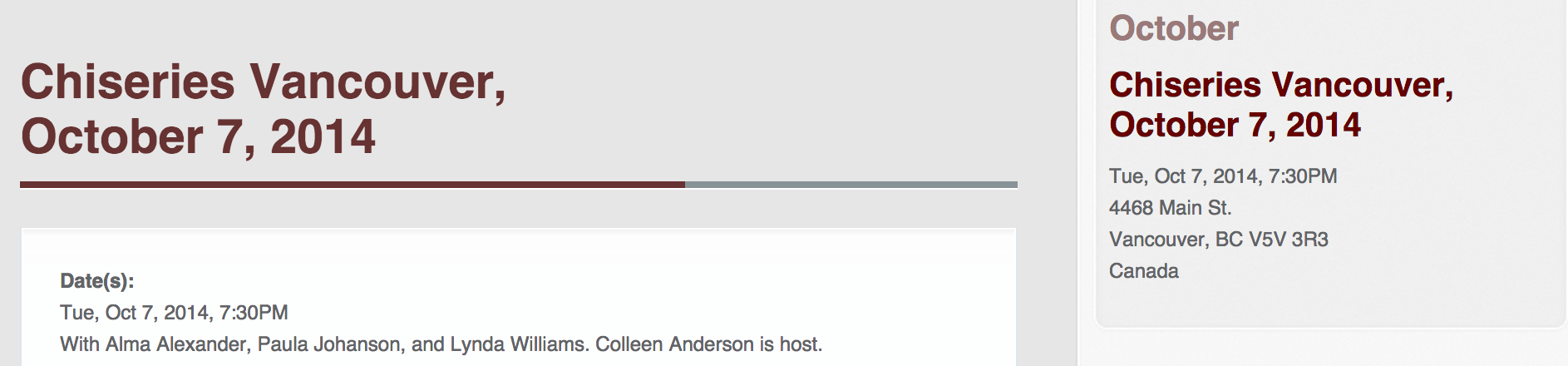 Preliminary info is up here: http://chiseries.com/event/chiseries-vancouver-october-7-2014
